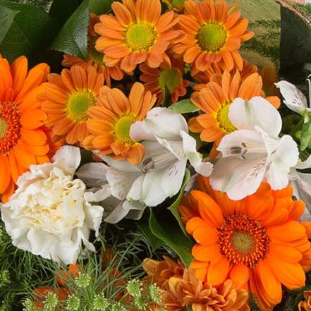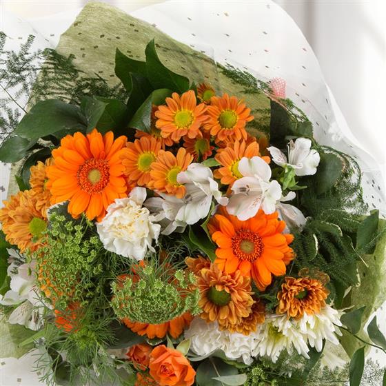 A simple hand-tied bunch of white and orange blooms including gerberas, chrysanthemums, carnations and alstromeria.