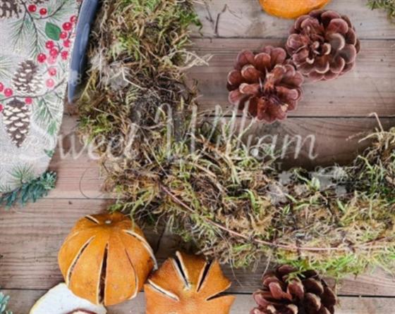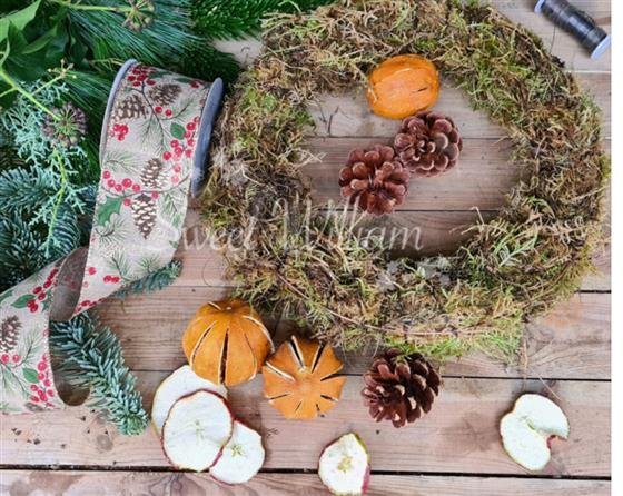 Kit includes wire ring, moss, Twine, stub wires, cones, cinnamon sticks, whole & fruit slices, luxury ribbon, a selection of festive foliage and a full A4 instruction leaflet. (Scissors/secateurs not provided).